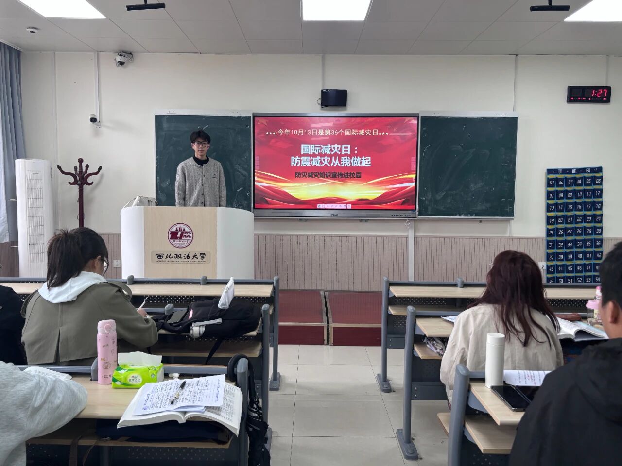 在班会上,常瑞峰系统阐述了“国际减灾日”的设立背景与核心意义,深入剖析了典型自然灾害的成因及其对校园安全的潜在威胁,并围绕灾害预防要点与应急处置措施进行了全面讲解,帮助同学们构建起涵盖灾前预防、灾中应对与灾后处置的全链条防灾知识体系。