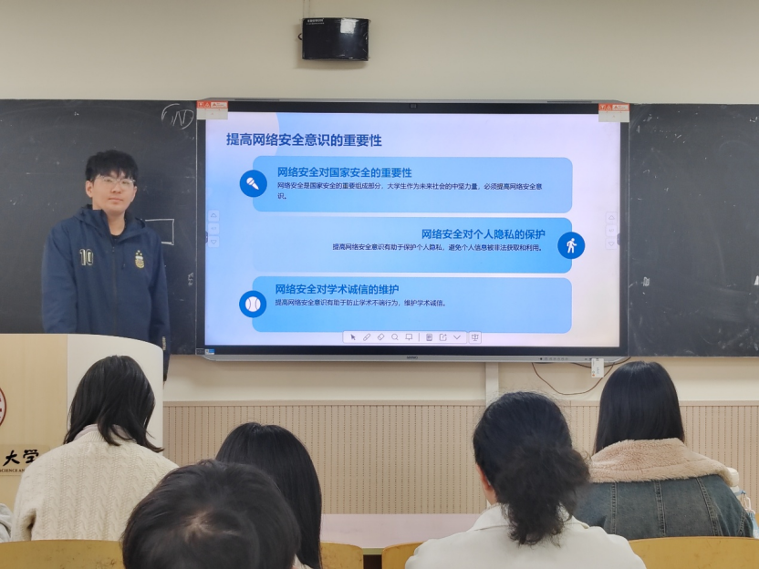 张云哲从“网络安全的现实意义”“大学生常见网络安全风险案例”“网络安全相关法律法规”三个维度展开讲解。结合大学生日常学习生活中的网络社交、信息填报、线上消费、娱乐追剧等高频场景,通过真实案例深入剖析网络诈骗、信息泄露、不良信息传播等常见风险,让同学们直观感受身边潜在的网络安全隐患。在法律法规普及环节,张云哲着重强调“网络空间绝非法外之地”,引导同学们自觉抵制网络谣言、网络暴力等不良信息,杜绝网络违法违规行为,深刻认识到提高网络安全意识的重要性。
